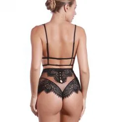 À l’arrière, des brides fines enserrent délicatement les courbes féminines, pour former une culotte ouverte sur les fesses.