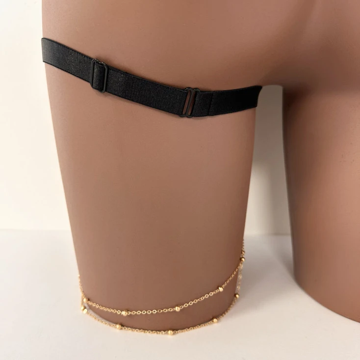 Des chaînettes dorées viennent se suspendre à la jarretière bijou, afin de sublimer la nudité d’une parure élégante et étincelante.
