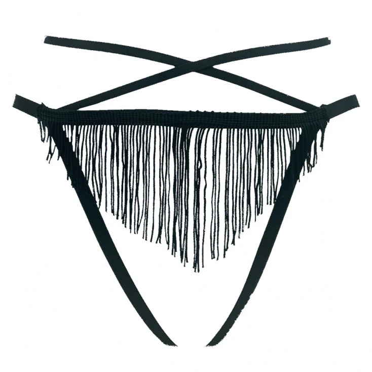 Le string ouvert à franges joue la carte de la séduction en associant avec audace les liens extensibles à l’esprit soft-bondage et les franges burlesques.