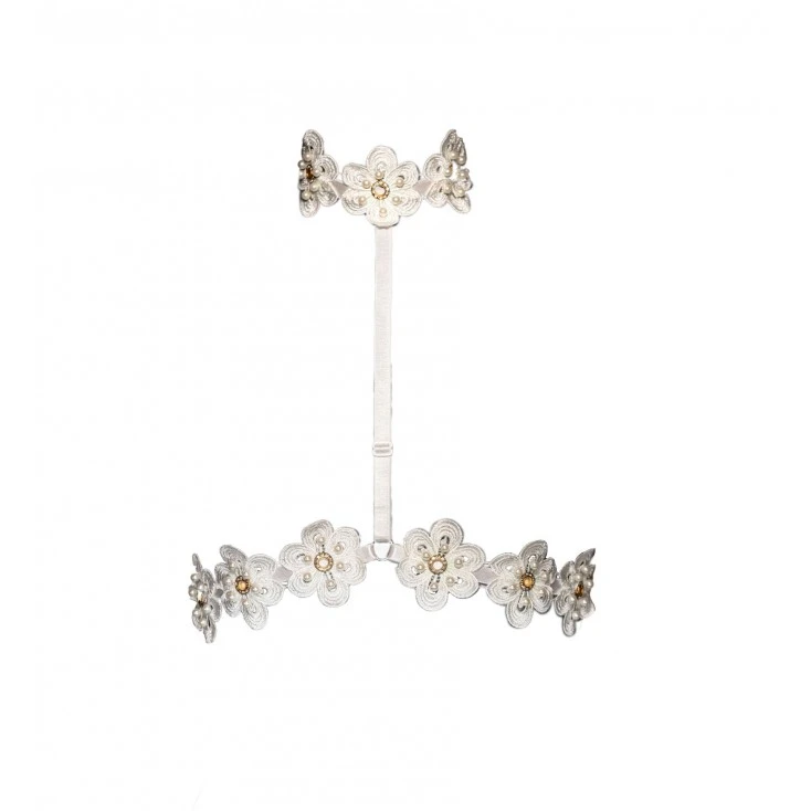 La harnais se compose d’une guirlande de fleurs en tissu positionnée juste sous la poitrine pour mieux la sublimer, tandis qu’une autre rangée fait office de ras-de-cou.