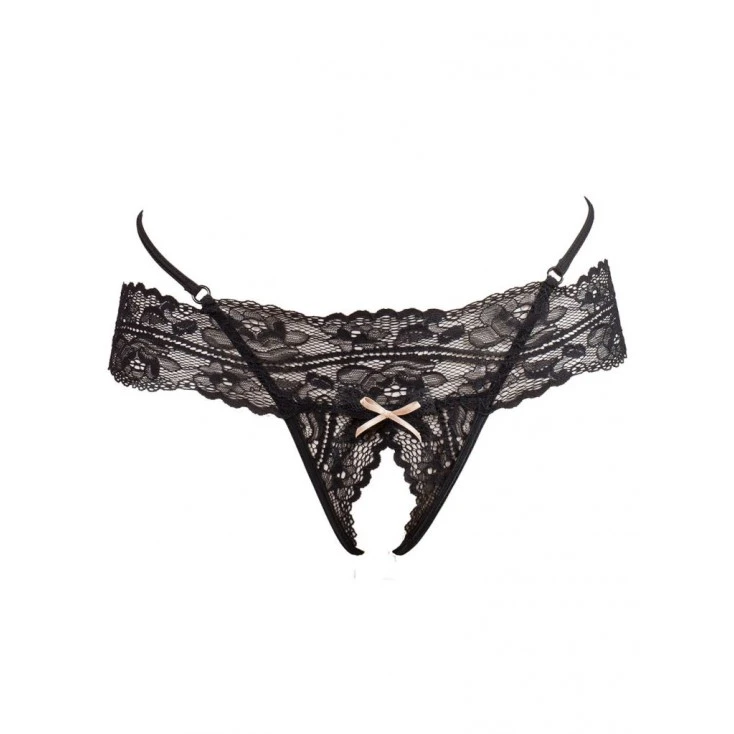 Ce string ouvert tout en dentelle est une création de la ligne « Réglisse » de la marque française de lingerie Luxxa.