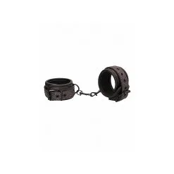 Ces superbes menottes sont munies de sangles en cuir reconstitué reliées entre elles par des anneaux en D et une chaßne métalliques. Les sangles comportent 6 trous de réglage pour les adapter à toutes les chevilles.