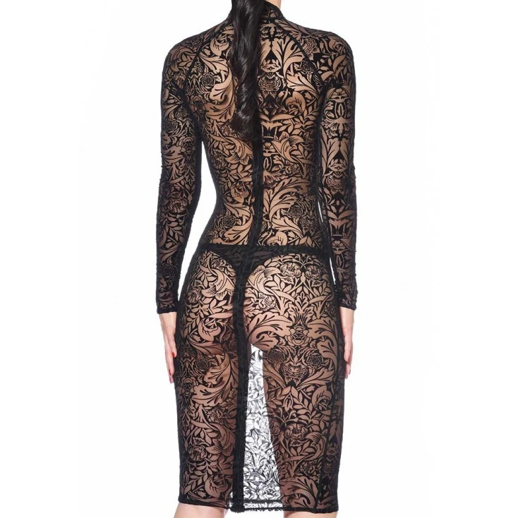 Cette robe moulante à manches longues est entièrement transparente et ornée de motifs d’inspiration Maori offrant un effet tatouage sur votre peau nue absolument bluffant et envoutant.