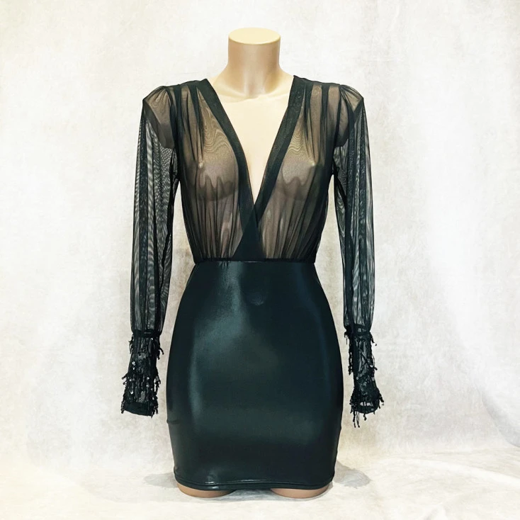 Idéale pour une soirée ou un rendez-vous coquin, cette robe courte et raffinée jouant sur la transparence et les découpes sensuelles vous assurera une allure sophistiquée et affriolante à la fois.