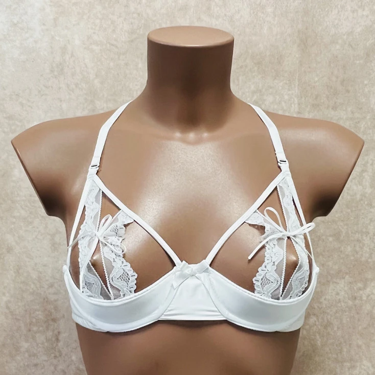 Deux galons de dentelle traversent chacun des bonnets tout en dévoilant votre téton offert au regard de l’être aimé. Un noeud à nouer et dénouer à l’infini en marque le coeur pour un rendu érotique.