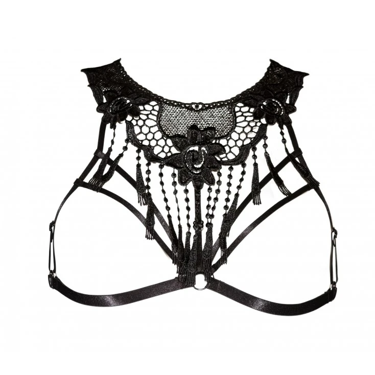 Une fleur brodée en marque le centre et capte tous les regards. Des franges de guipures perlées descendent le long de votre poitrine tout en l’enserrant avec raffinement.