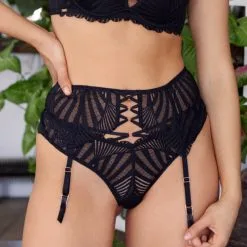 Le porte-jarretelles se pare d’une somptueuse dentelle légèrement ajourée et recouverte de motifs graphiques séduisants, pour envelopper majestueusement les hanches tout en soulignant la taille avec délice.