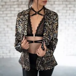 Un imprimé léopard vient ajouter une touche féline des plus séduisantes, en plus de scintiller d’un doré envoûtant qui attirera les regards de manière irrésistible.